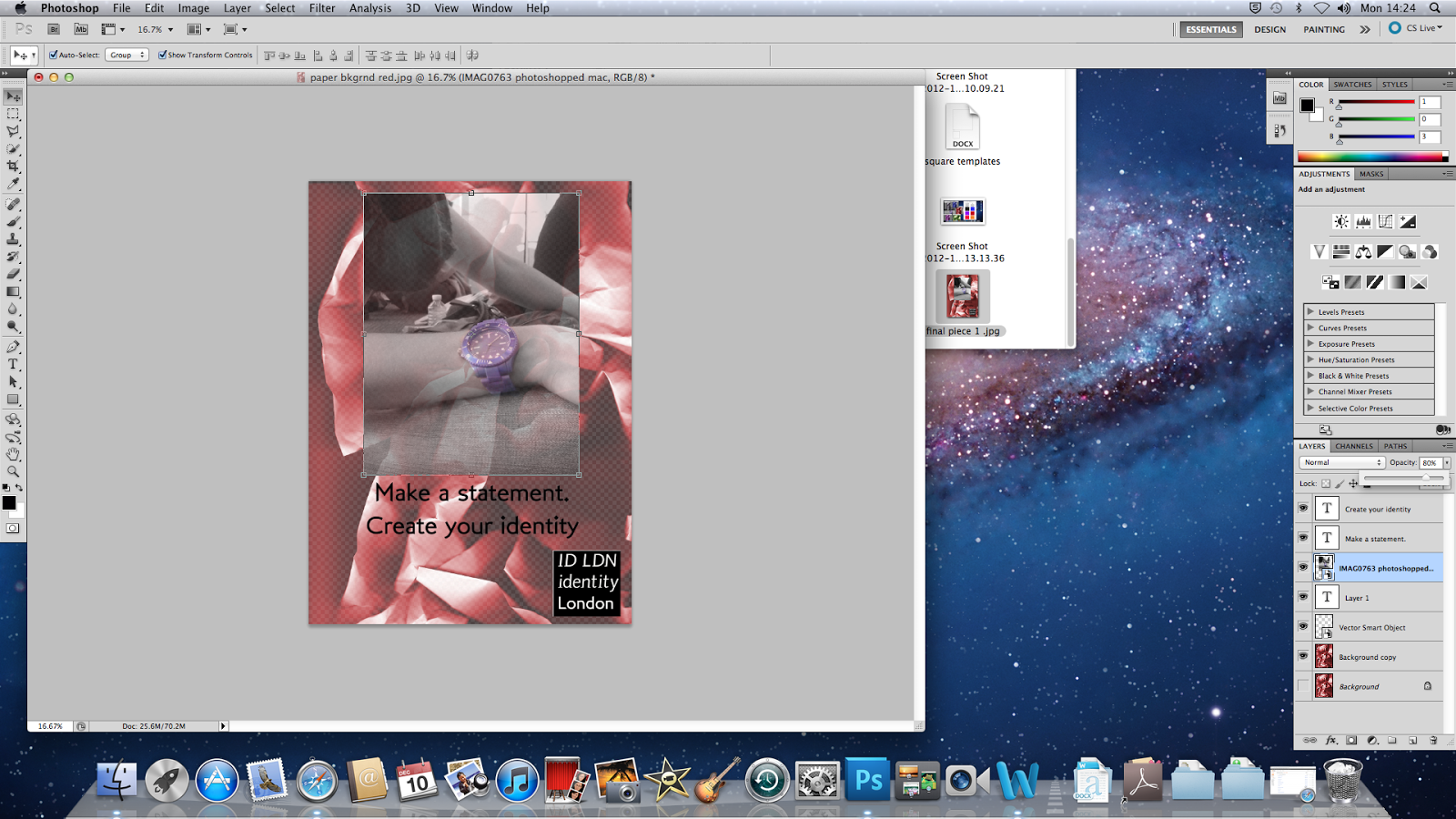 These are different processes that I took in Photoshop to edit my piece and change it to make it slightly better.