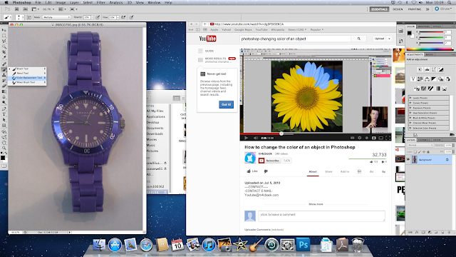 This is my edited photo of the watch on its own, I decided to change the colour of the watch this way I would be able to show the watches come in different colours however there were so many different coloured shadows on the watch that it was difficult to get it right and so did not turn out as I had hoped it would so am not using this technique in my final piece. These are the steps that I used to change the colour.